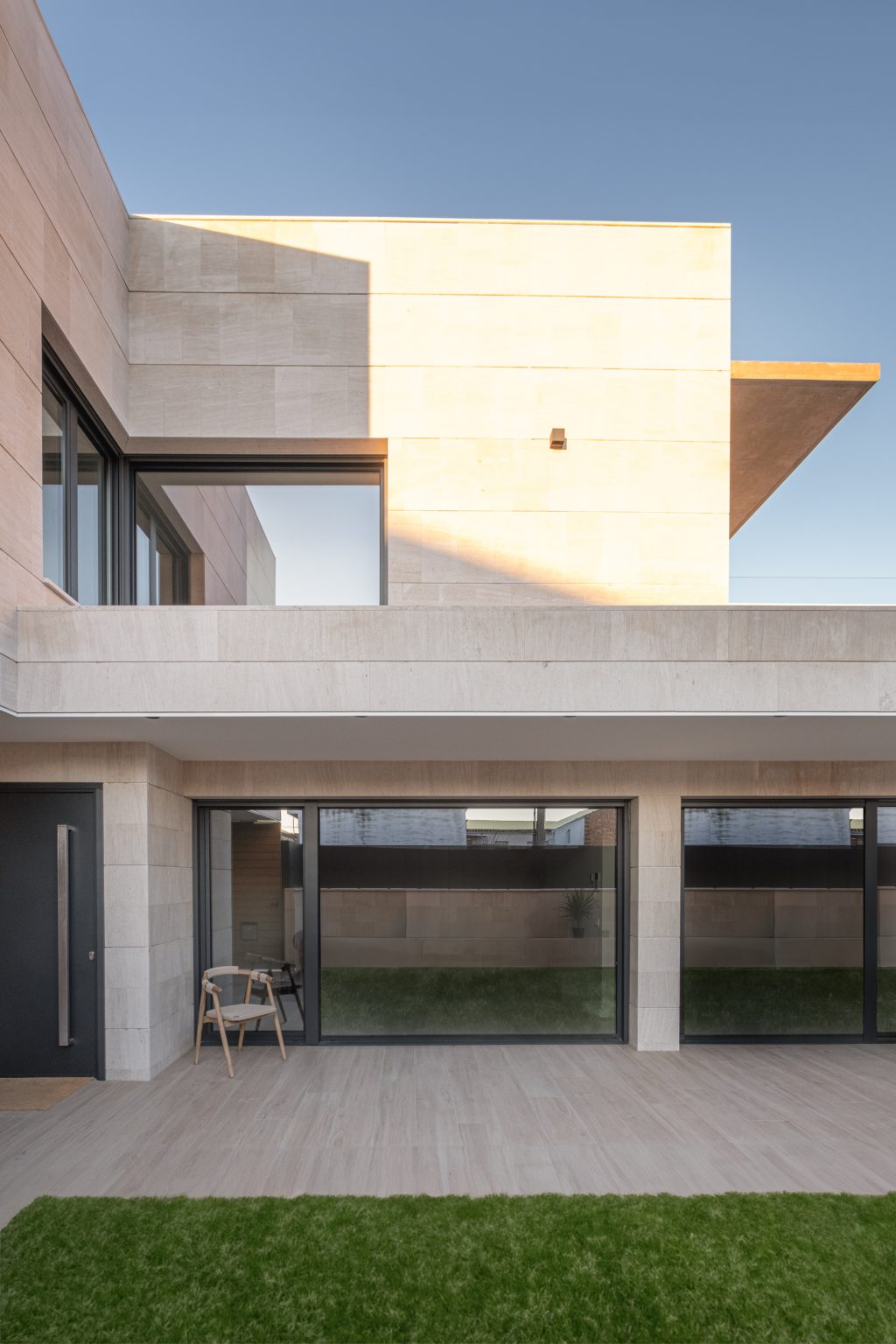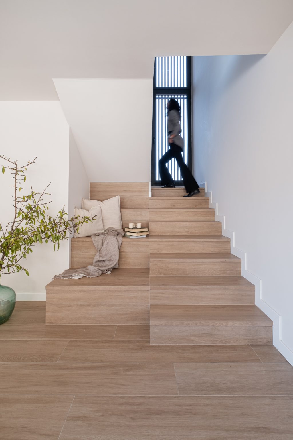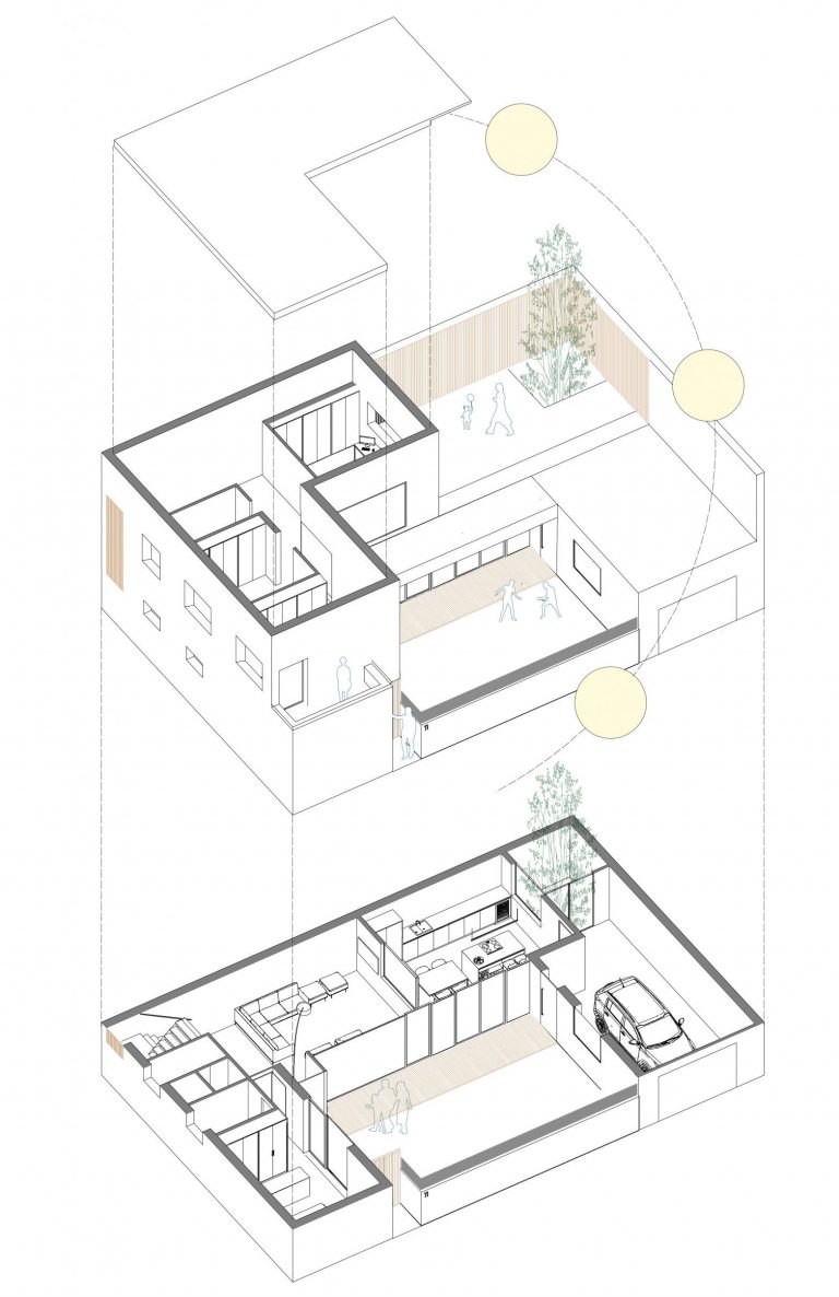 La vivienda se distribuye en dos plantas, cuya planta baja se destina a la zona de día de la casa. A través de una escalera bañada por completo por la luz natural, gracias a su gran lucernario vertical, se llega a la planta primera: zona destinada a los hijos, con habitaciones para ellos y zonas intermedias donde poder relacionarse y disfrutar en común.