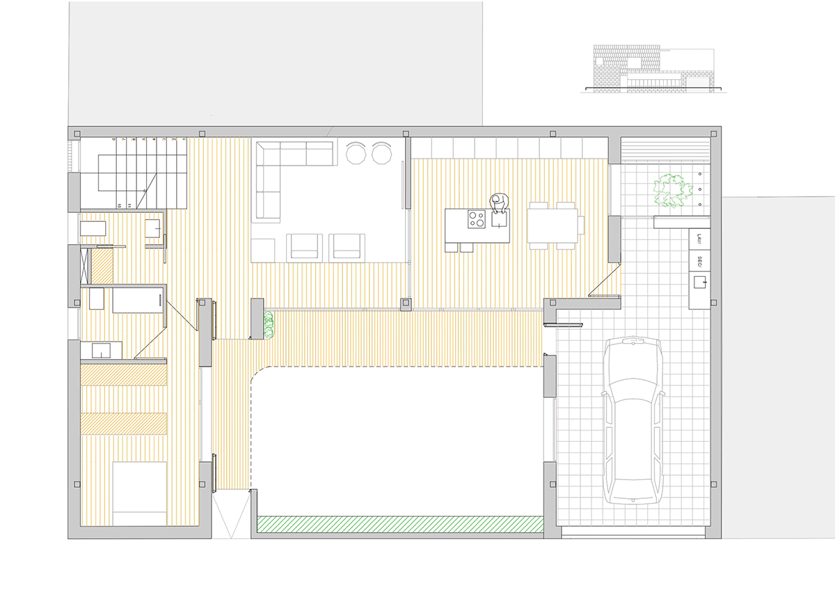 En planta baja encontraremos dos zonas diferenciadas: zona diurna y zona nocturna. A pesar de estar relacionadas, se busca no tener que atravesar estancias comunes para llegar a las zonas más privadas de la casa y viceversa, optimizando al máximo las circulaciones que se generan en ella. También se persigue la idea de eliminar todas las barreras arquitectónicas posibles pensando en el futuro de los propietarios.
